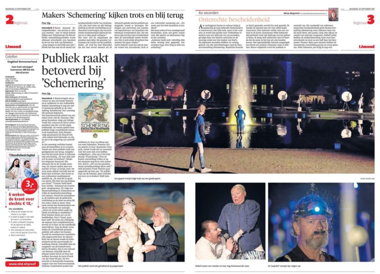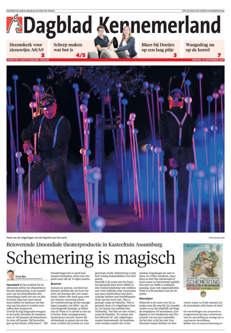 “Het publiek bij de allereerste editie van theatermanifestatie SCHEMERING, in de kasteeltuin van het Heemskerkse slot Assumburg, heeft een uur en drie kwartier lang met open mond staan kijken en luisteren om dan nog aan het eind te worden overvallen door kippenvel.”– Friso Bos in het NoordHollands Dagblad, 22-09-2017